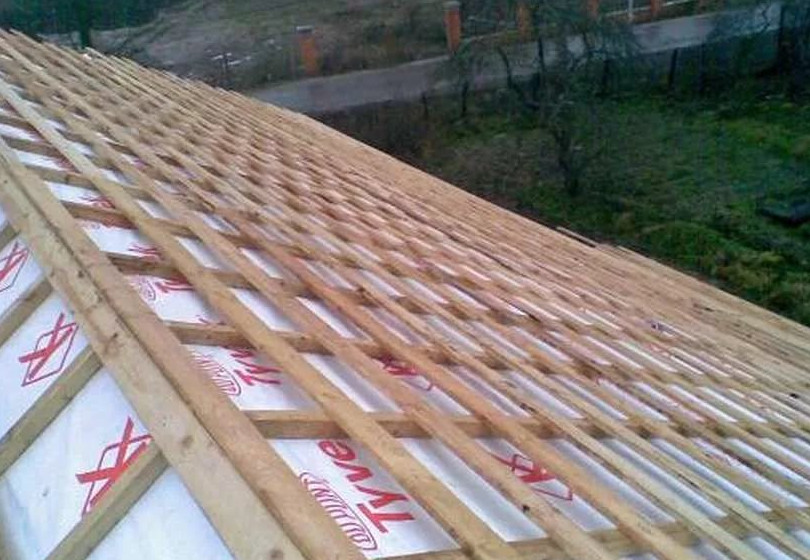 - Поверх стропил натягивают гидроизоляционную плёнку и фиксируют её контробрешёткой из брусков с сечением 40х40 или 50х50 мм.