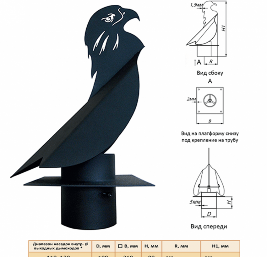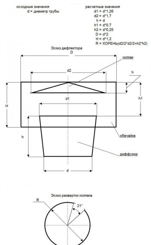 Все размеры дефлектора задаются относительно диаметра трубы дымохода