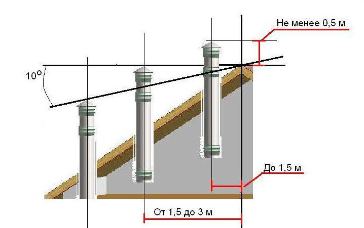 - на полметра выше конька, если труба находится на расстоянии до полутора метров от него;