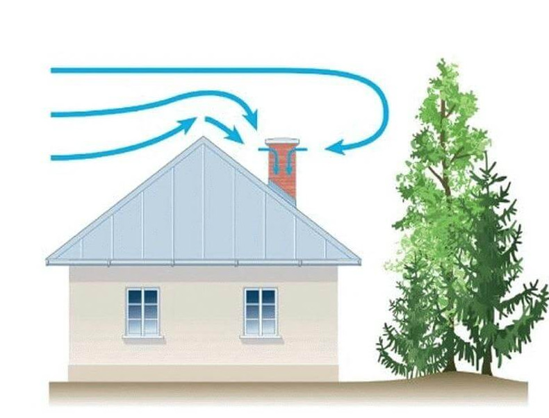 При наличии рядом с дымоходом высоких построек или деревьев ветер может мешать выходу дымовых газов вплоть до создания обратной тяги