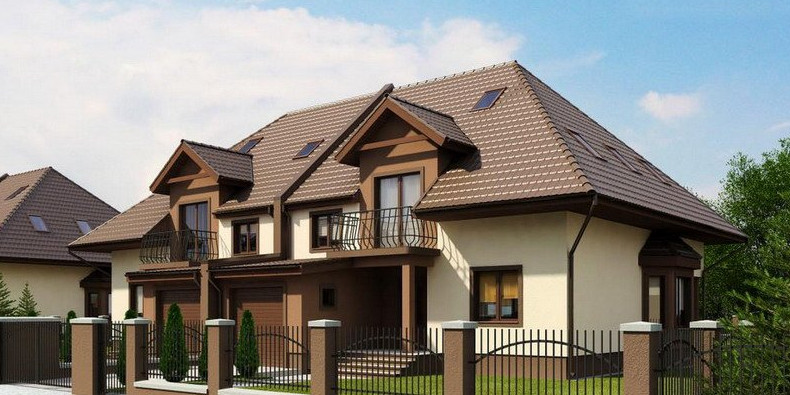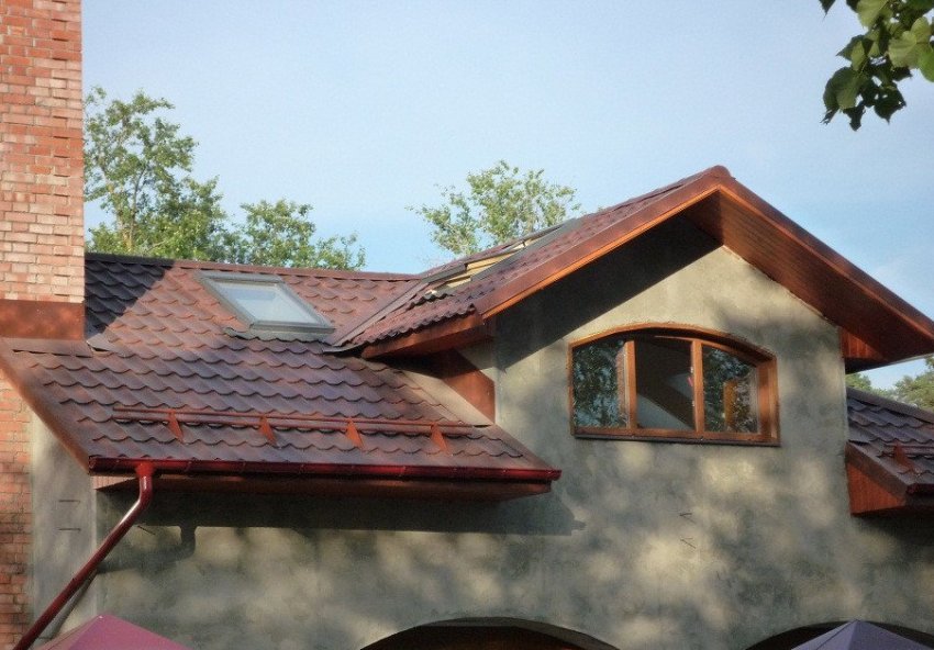 Кровля дома, покрытая металлочерепицей «Монтеррей» шоколадного цвета, выглядит добротно и престижно