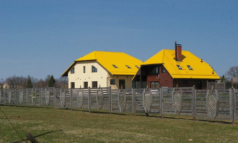 Кровля жёлтого цвета из металлочерепицы «Монтеррей» смотрится ярко и жизнерадостно, являясь цветовым воплощением энергии, движения и позитива, но предъявляет повышенные требования к дизайну всего строения
