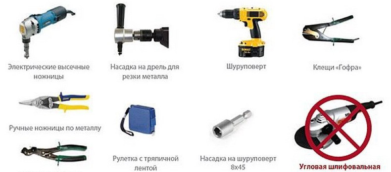 - шуруповёрт и инструмент для резки листов — электролобзик, дисковую пилу или ножницы по металлу;