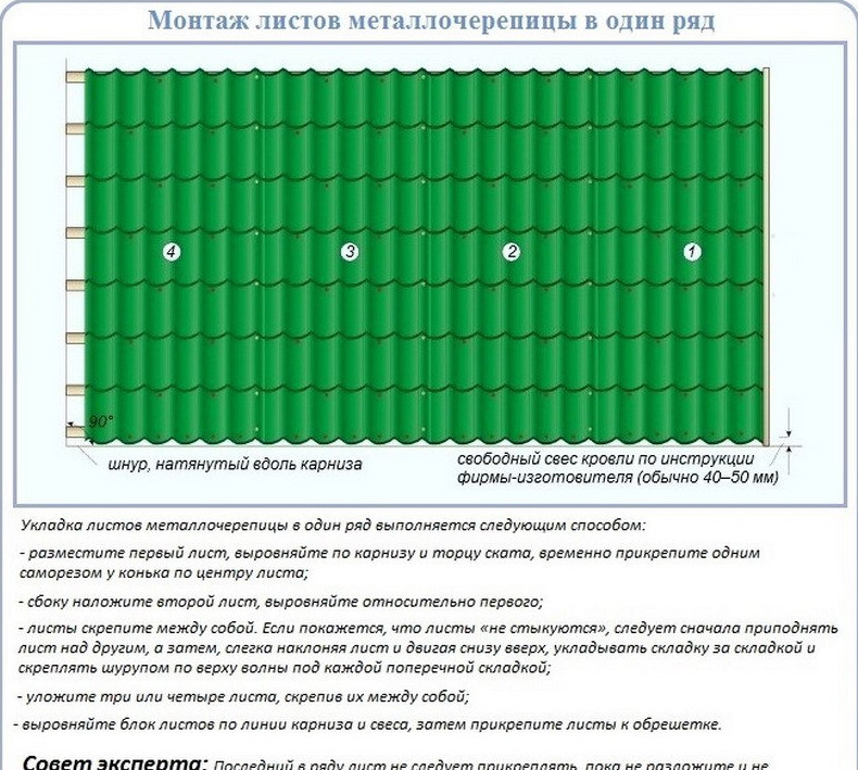 На первом этапе металлочерепичные листы укладываются в один ряд и крепятся друг к другу