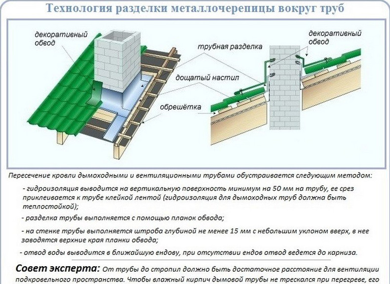 Технология укладки листов металлочерепицы вокруг труб предполагает устройство герметичного фартука из металлических листов