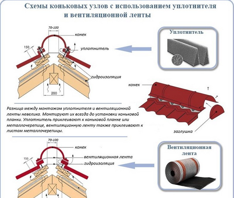 При обустройстве конькового узла под металлочерепицу используют две схемы: с применением уплотнителя или с прокладкой вентиляционной ленты