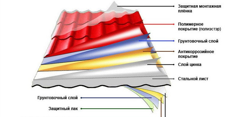 - Первый слой (оцинковка) и второй — антикоррозийное покрытие — предохраняют листы от коррозии и ржавчины. Это очень значимые функции для долговечности укрывного настила, поэтому эти два пласта защищены от истирания следующими прослойками.
