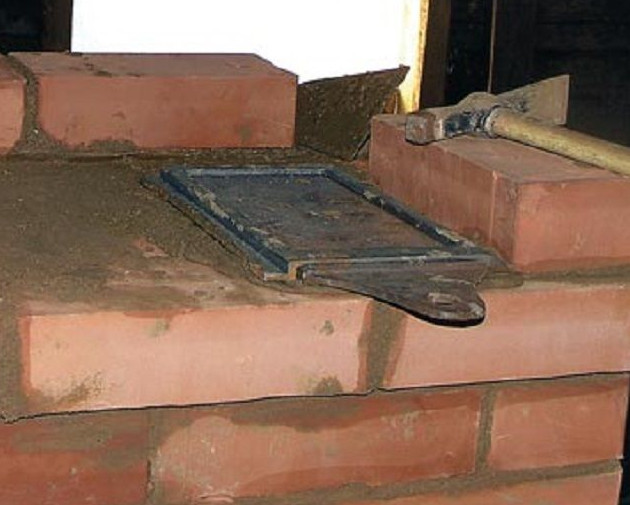 - 6 ряд — ставят дверки из чугуна для топочной камеры. Элемент фиксируют на своём месте, используя стальную проволоку и цементный раствор. Чтобы конструкция из кирпичей не стала хрупкой из-за сильного нагрева чугуна, зону вокруг дверки обматывают шнуром из асбеста.