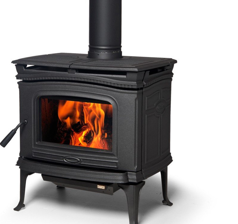 - Чугунная дровяная печь — устройство нагрева помещения, используемое как дополнительный источник тепла. Дым и газы удаляются из него по гофрированному дымоходу или рукаву. Печь из чугуна нагревает воздух в доме очень быстро и монтируется в любой зоне дома. Оснащённая воздуходувом, она позволяет комнатной температуре оставаться комфортной долгие часы.