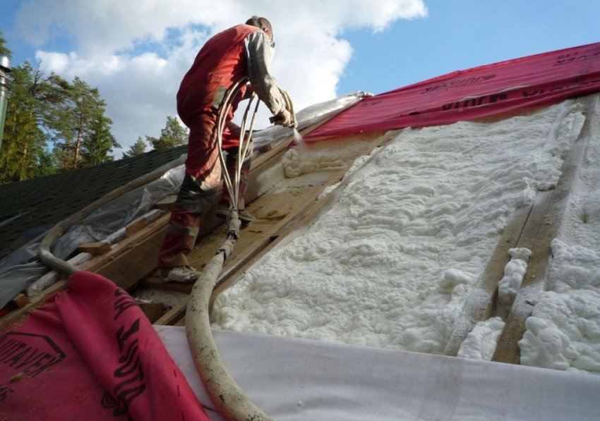 Пенополиуретан — тоже близкий родственник пенополистирола, но в отличие от последнего не продаётся в готовом виде. Химическая реакция, при которой образуются пупырышки полимера, проходит уже на вашей крыше, поэтому полиуретановая пена гарантированно заполняет малейшие щели между стропилами. Кроме обеспечения равномерного бесшовного покрытия материал обладает и другими достоинствами: