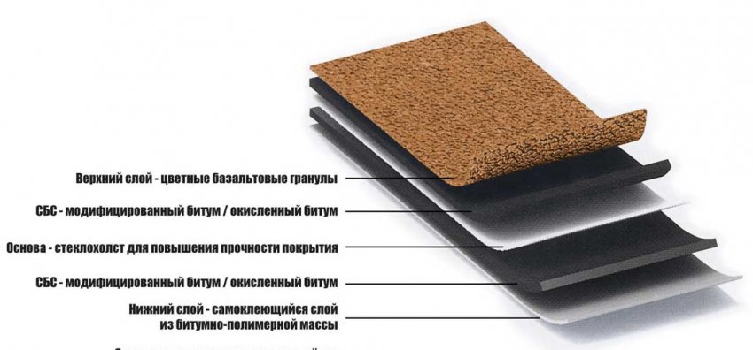 Независимо от цветовой гаммы, свойств, формы и цены гибкая черепица имеет одинаковую шестислойную структуру: