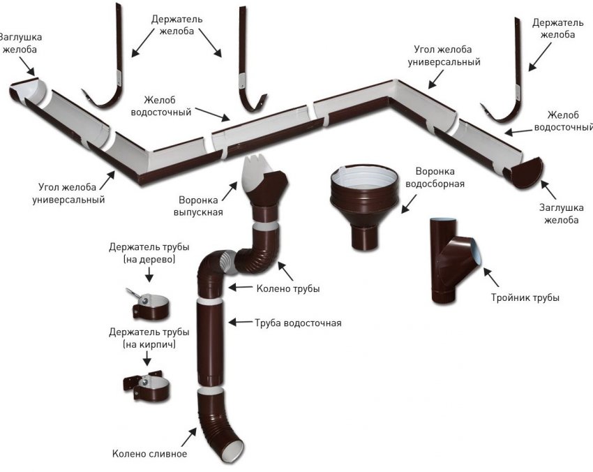 Водосточная система кровли состоит из нескольких элементов: лотки-желоба, трубы, воронки, сливы, заглушки, кронштейны и хомуты