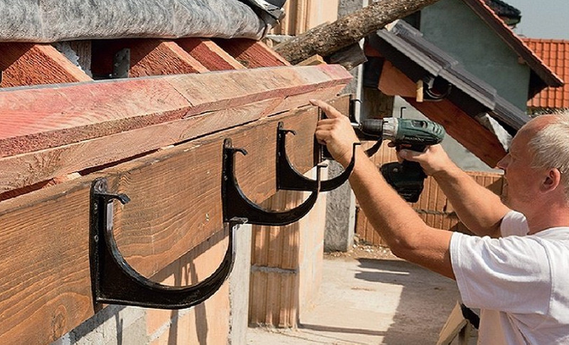 - В первую очередь устанавливаются и крепятся к стропильной системе кровли кронштейны под желоба. Монтаж проводится с учётом угла наклона.