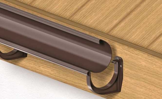 - Крепление желобов к кронштейнам производится разными способами: защёлками, стяжками и прочими крепёжными конструкциями.