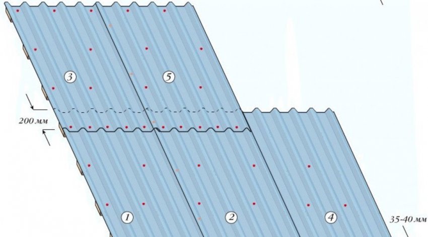 - При уклоне крыши на 35–50 градусов будет достаточно соприкосновения кромок листов на 10–15 см.