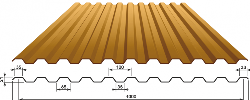 Все размеры указываются в миллиметрах. Например, по маркировке С10–0,5–1100 можно выяснить, что высота волны профнастила равна 10 мм, толщина — 0,5 мм, а полезная ширина — 1100 мм.
