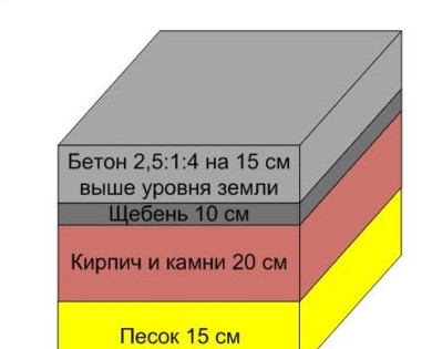 Фундамент закладывается в несколько слоев: нижний — песок, потом — камни и кирпичи, которые засыпают щебнем и заливают бетоном