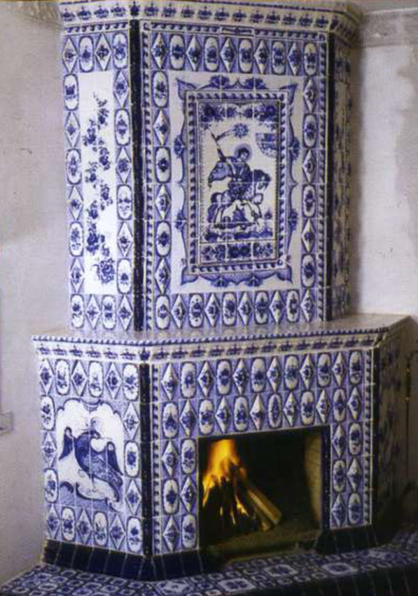 Покрытая расписными изразцами голландская печка отлично вписывается в интерьер загородного дома