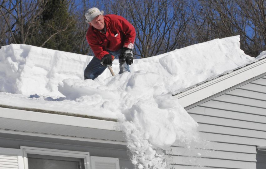 При проведении чистки крыши зимой снег не надо счищать полностью, чтобы не испортить кровельное покрытие, лучше оставить слой в 5–10 см