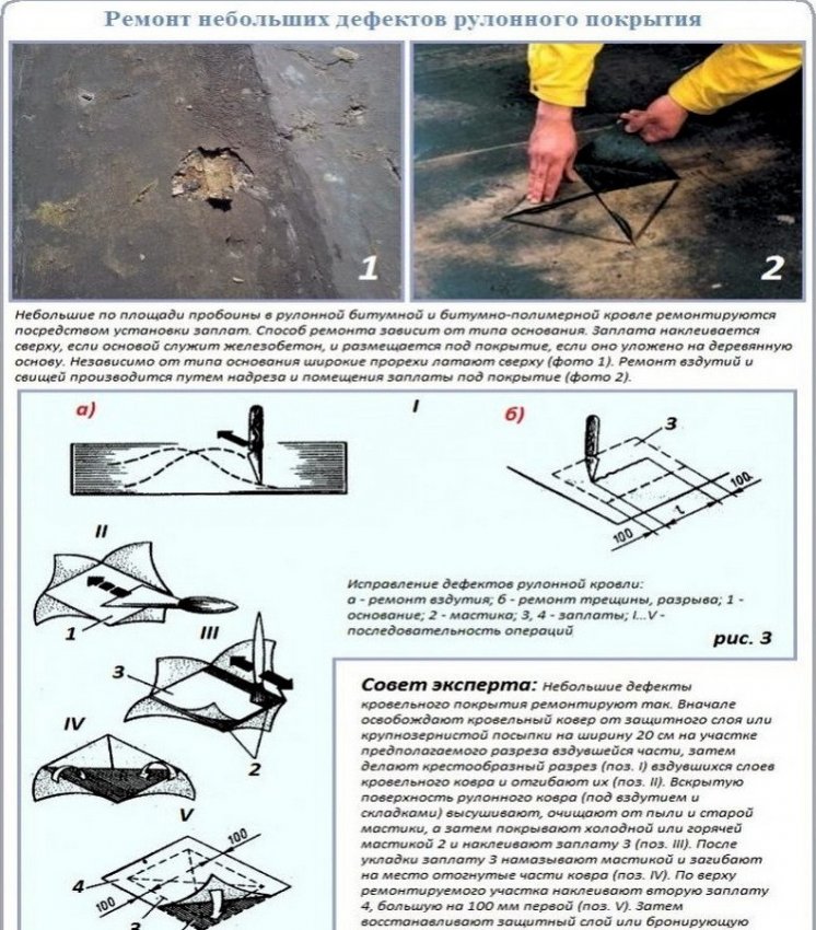 Небольшие повреждения ремонтируют с помощью мастики «Технониколь № 71» с армированием стеклосеткой. Заплатку подбирают с таким расчётом, чтобы она перекрывала место повреждения не менее чем на 10 см со всех сторон.