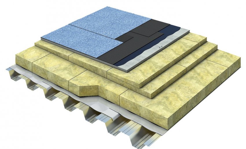 В качестве теплоизоляции используется два вида утеплителей: материал с меньшей плотностью используют как основание, а более жёсткий с посыпкой — в качестве верхнего слоя, что значительно сокращает расходы на обустройство кровли.