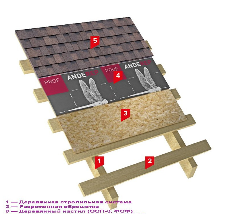- В первую очередь это системы с покрытием «Шинглас» и элегантной композитной черепицей, необходимые при обустройстве неотапливаемого чердака, а также для строительства домов в мягких климатических условиях. При устройстве кровельного пирога по деревянной стропильной системе на сплошной настил для гидроизоляции укладывают подкладочные материалы серии Anderep. Для настила подойдёт влагостойкая фанера, плита стружечная или обрезная доска с влажностью не более 20%, обработанная антисептиком.