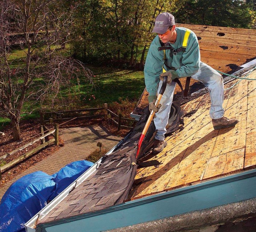 - Удаляют часть внешнего покрытия крыши. Для этого его либо вырезают, либо снимают с помощью крюка и ломика, в зависимости от самого материала.