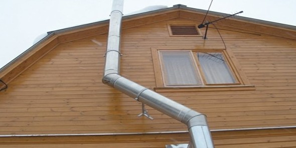 - придётся проходить как минимум две конструкции — перекрытие и кровлю, при этом нужно учитывать относительную сложность процесса герметизации прохода крыши. При наружном же размещении проём нужно будет пробить только один раз — в стене, при этом вместо герметизации просто устанавливаются декоративные заглушки;
