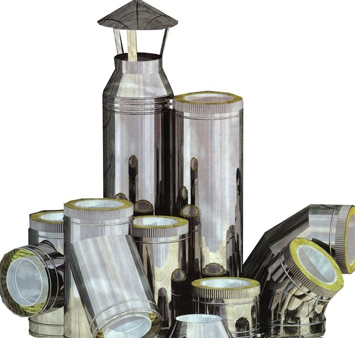 Эту конструкцию также называют модульным дымоходом. Модули — это детали, из которых можно собрать дымоход любой конфигурации: отрезки трубы, тройники, отводы с углом в 45 и 90 градусов, ревизии, конденсатосборники и пр. Каждый элемент выполнен из нержавеющей стали, укутан в каменную вату (один из самых эффективных теплоизоляторов) и заключён в защитно-декоративный кожух из дешёвой нержавейки или оцинкованной стали. Клиенты побогаче приобретают сэндвич-дымоходы в защитном кожухе из меди или алюминия.