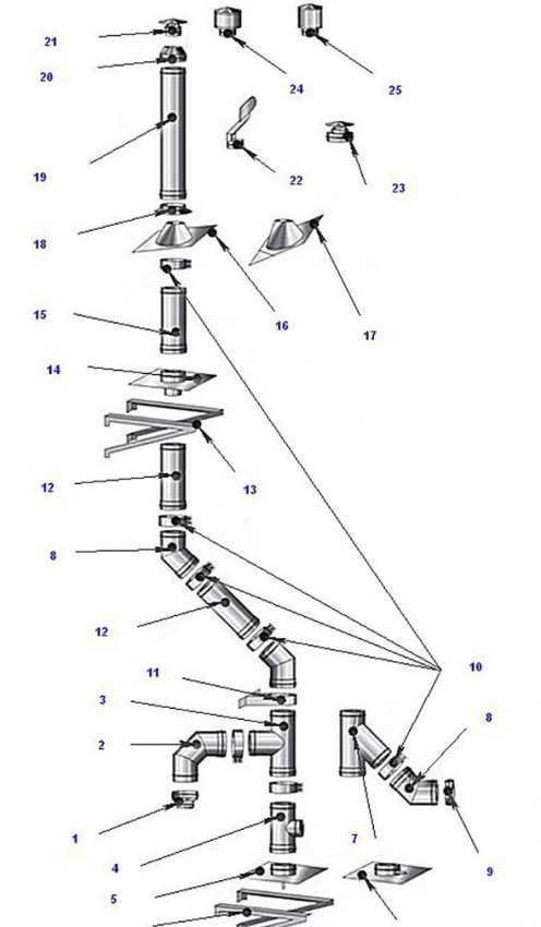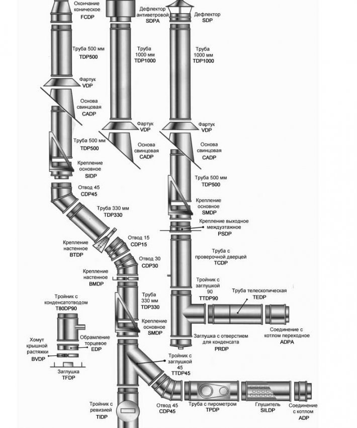 При наличие такого большого количества различных переходников, соединителей, проходных сервисных элементов и других деталей можно собрать дымоход любой конфигурации