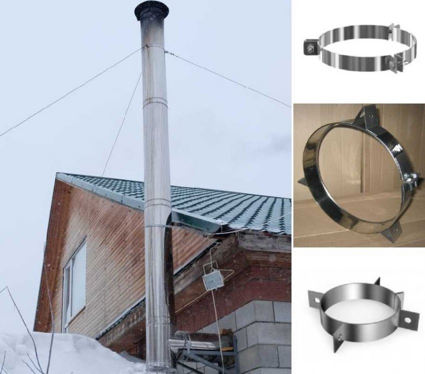 При большой высоте надкровельной части дымохода его дополнительно укрепляют на растяжках при помощи специального хомута