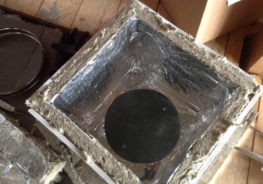 В месте прохода через перекрытия монтируют металлический короб с утеплёнными стенками, затем вставляют трубу и заполняют оставшееся пространство негорючим утеплителем