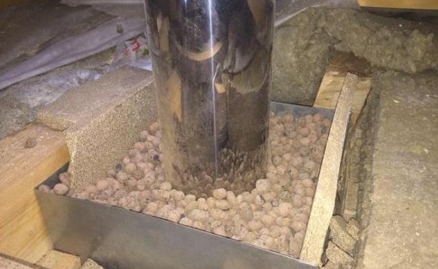 - Для обеспечения пожарной безопасности проём заделать негорючими материалами. Можно использовать керамзит, представляющий собой вспененную и запечённую глину в виде гранул. Можно заложить утеплитель из минеральной плиты. Но самым популярным материалом для устройства межэтажного прохода дымохода является абсолютно не горючая базальтовая вата. Поверх противопожарного перехода, со стороны чердака проём закрывается таким же образом асбестовым и нержавеющим листом.
