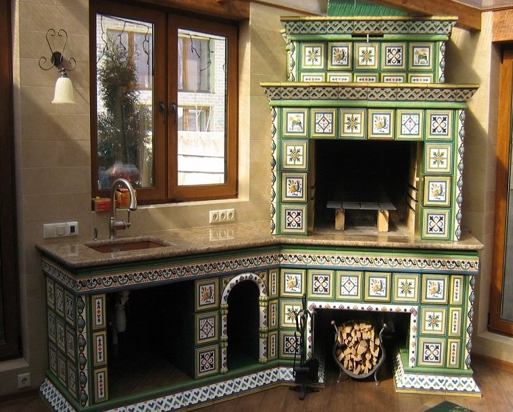 - на кухне редко встречается настоящий камин, но вполне возможно установить декоративный или фальш-камин. При этом он должен быть оформлен облицовочным камнем, имитирующим настоящую кирпичную кладку. Камин лучше всего разместить в зоне отдыха, в углу или вдоль стены. В очень просторном помещении располагают такой элемент в центре кухни. Можно заменить камин небольшой печью, которая сделает восточный интерьер более естественным;