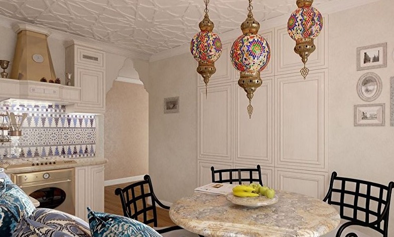 - керамическая плитка, натуральные ткани, древесина, керамогранит, стекло — оптимальные материалы для кухни в арабском стиле. Лучше избегать обилия пластика и хромированного металла, но если нужно придать обстановке нотку современности, можно использовать серебристую бытовую технику, мебель с металлическими ножками, пластиковые плафоны, люстру и т. п.;