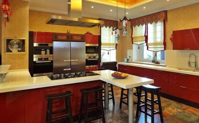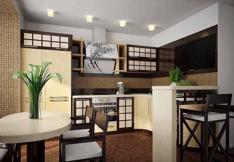Все восточные виды дизайна интерьеров характеризуются умеренной яркостью, наличием этнических деталей и применением натуральных материалов. При этом есть у них и особенности, которые учитывают при оформлении кухни.
