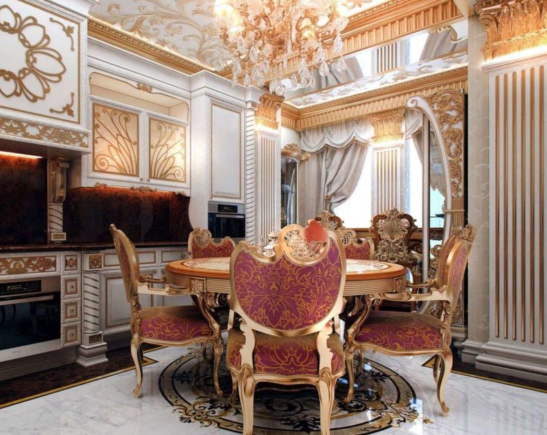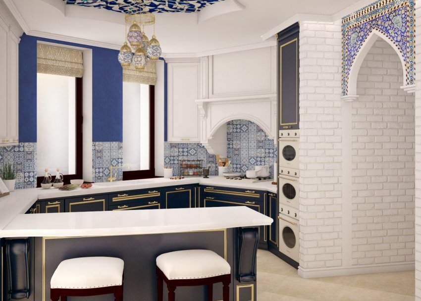 Арабский дизайн кухни — это не только яркие цвета, но и обилие замысловатого декора, мозаика, сложные растительные принты. При этом каждая деталь обстановки должна быть высокого качества, так как арабское оформление отличается роскошью. Характерны для него и другие особенности: