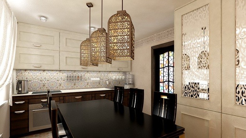 - главный осветительный прибор на кухне с восточным дизайном — кованая люстра. Её легко дополнить точечными светильниками, расположив их по периметру потолка. Они могут быть встроенными или накладными со стеклянными узорчатыми плафонами. Обеденный стол украсит компактный светильник в кованом плафоне, а в зоне отдыха удобны торшеры, обеспечивающие мягкий свет.
