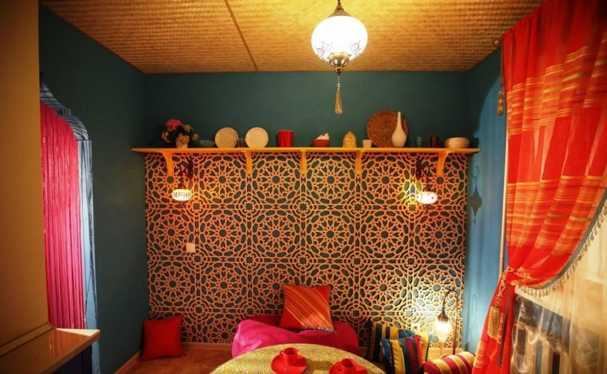 - яркие диванные подушки в зоне отдыха, пуфы, деревянные полки, напольные вазы, расписные блюда, статуэтки из глины и другие подобные детали украсят обстановку и подчеркнут восточный стиль. В помещении достаточно 2–3 таких элемента, ведь большее их количество может сделать интерьер захламлённым;