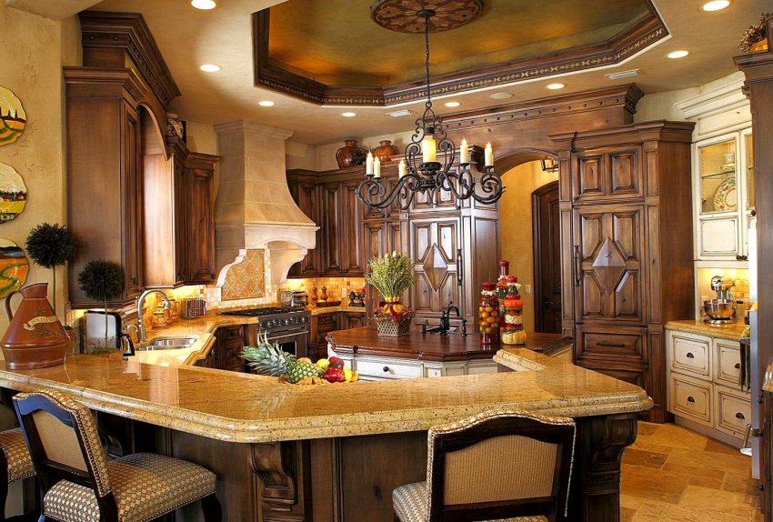 - мебель из древесины — обязательная деталь обстановки. Поэтому обеденный стол, стулья, кресла и другие предметы на кухне выполняют из натурального дерева разных пород. Бюджетным вариантом является сосна, а наиболее дорогостоящим решением будет мебель из красного дерева, ореха или дуба. Материал можно окрасить в любые цвета морилкой, краской, лаком для древесины. Приветствуется декор в виде резьбы на стульях, ножках столов и других деталях. Предметы могут иметь слегка состаренный вид. Обеденную зону стоит разместить отдельно от гарнитура, например, около противоположной стены или в углу;