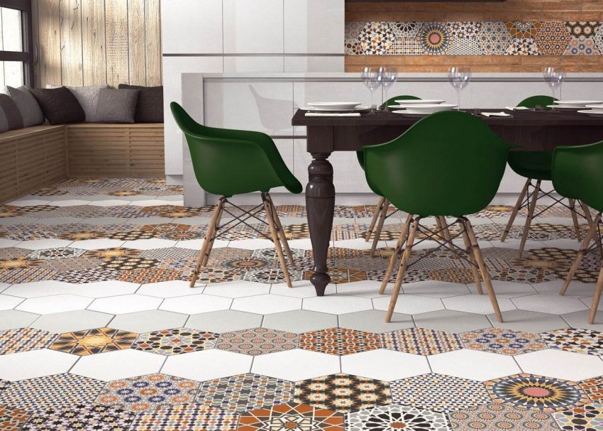 - в качестве напольного покрытия используют керамическую плитку, керамогранит, натуральную древесину. Следует выбирать естественные цвета для пола, но можно комбинировать контрастные оттенки. Если требуется применение пёстрой плитки, то лучше всего выбрать лаконичную мебель, но повторить принт на плитке в области фартука или текстиле, что обеспечит гармоничность интерьеру;