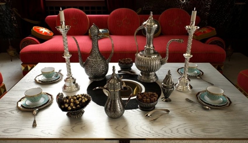 Металлическая и фарфоровая посуда хорошо подходят для восточного интерьера