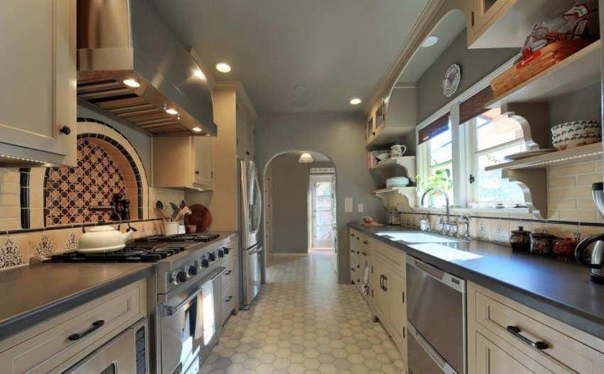 Металл уместен для вытяжки в рабочей зоне кухни в арабском стиле