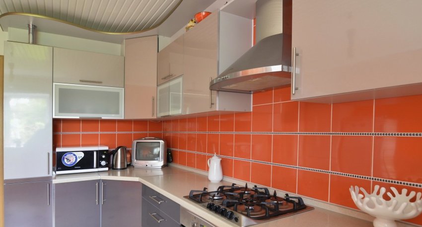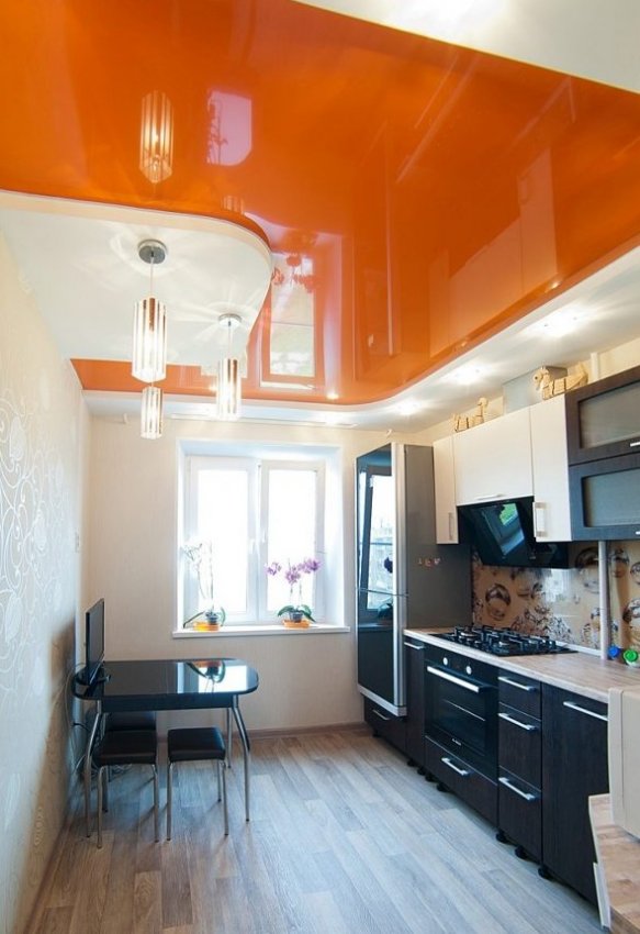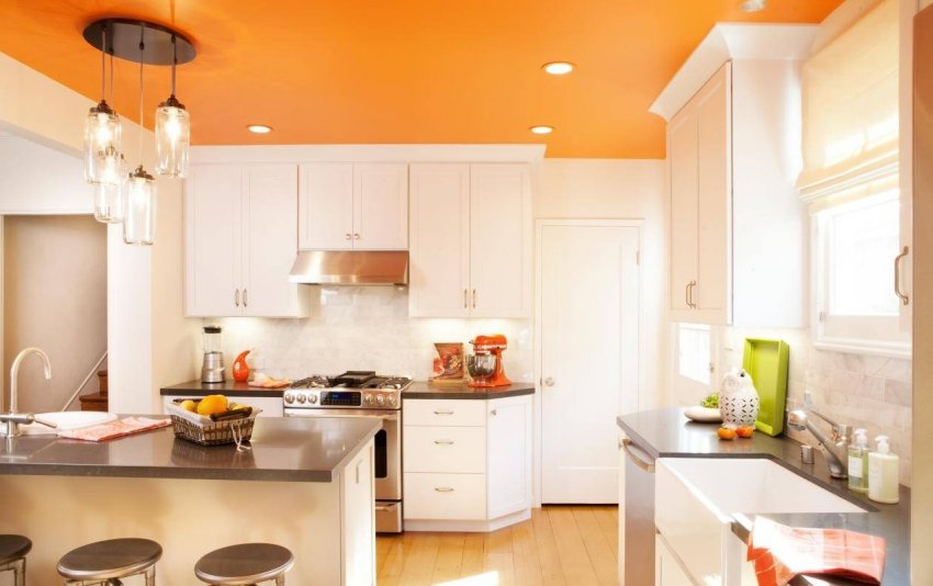 - оранжевый потолок — необычное решение для кухни. Для этой цели используют натяжное покрытие или создают гипсокартонную конструкцию, которую после монтажа окрашивают. При этом стоит учесть, что яркий оранжевый цвет может визуально уменьшить высоту потолка и поэтому не стоит делать поверхность в таком цвете при высоте менее 2,7 м. Для низких потолков более уместна бело-оранжевая расцветка. С помощью этого можно визуально зонировать кухню. Например, апельсиновым цветом часто выделяют потолок над рабочей зоной, а остальную поверхность делают белой;