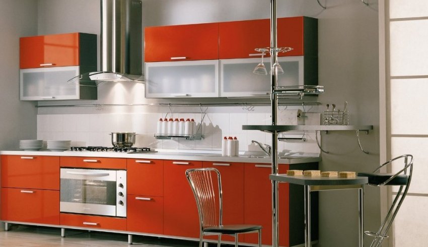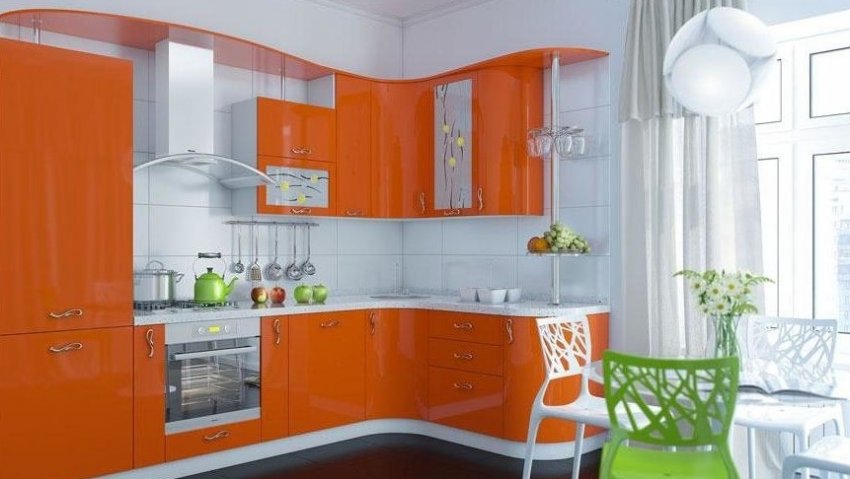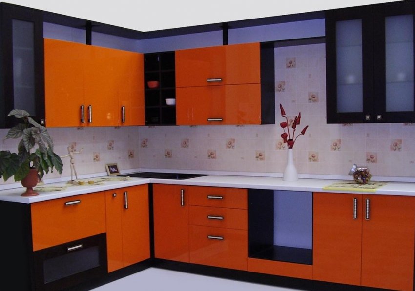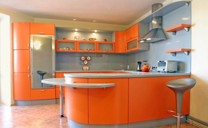 - оранжевый кухонный гарнитур — одно из простых решений для применения насыщенного цвета в обстановке. При этом шкафы могут быть полностью оранжевыми или двухцветными, например, апельсиновый в сочетании с серым. В любом случае стоит избегать иных ярких деталей в интерьере, дополнив гарнитур лишь яркой посудой или салфетками на обеденном столе. Если глухие и однотонные фасады делают шкафы слишком броскими, то можно использовать дверцы со стеклянными филёнками. В расцветке гарнитура также могут чередоваться два разных тона. Мебель часто изготавливается из ЛДСП, но можно для этого использовать и древесину;