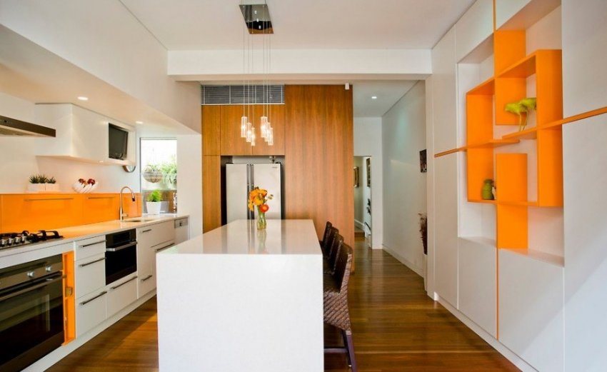 Белая мебель эффектно контрастирует с оранжевыми поверхностями