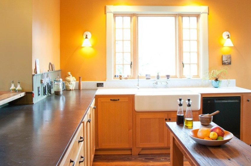 Деревянная мебель уместна на кухне с оранжевыми стенами