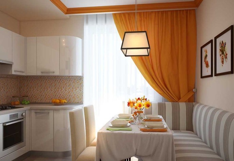 - текстиль терракотового или более светлого тона оживит и сделает жизнерадостным даже самый мрачный интерьер кухни. Шторы могут быть рулонными, римскими, классическими портьерами или в виде лёгкого полупрозрачного тюля персикового цвета. Допустимо использование тканей, в расцветке которых присутствует оранжевый и другие яркие цвета, например, жёлтый. Салфетки, ковёр, полотенца дополнят занавески.