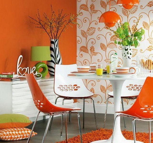 - стены мандаринового тона могут быть окрашены, оклеены обоями или оформлены ПВХ панелями. Если сделать стены наполовину яркими или выделить цветом только одну стену, то можно визуально расширить пространство, что актуально для помещений площадью менее 10 м2. При низком потолке эффективно увеличивают помещение обои в вертикальную полоску. Оранжевого цвета может быть совсем немного на стенах. Для этого выбирают панели или обои лишь с небольшим узором апельсинового или персикового оттенка, а основной фон белого, серого или бежевого цвета обеспечит гармоничность;