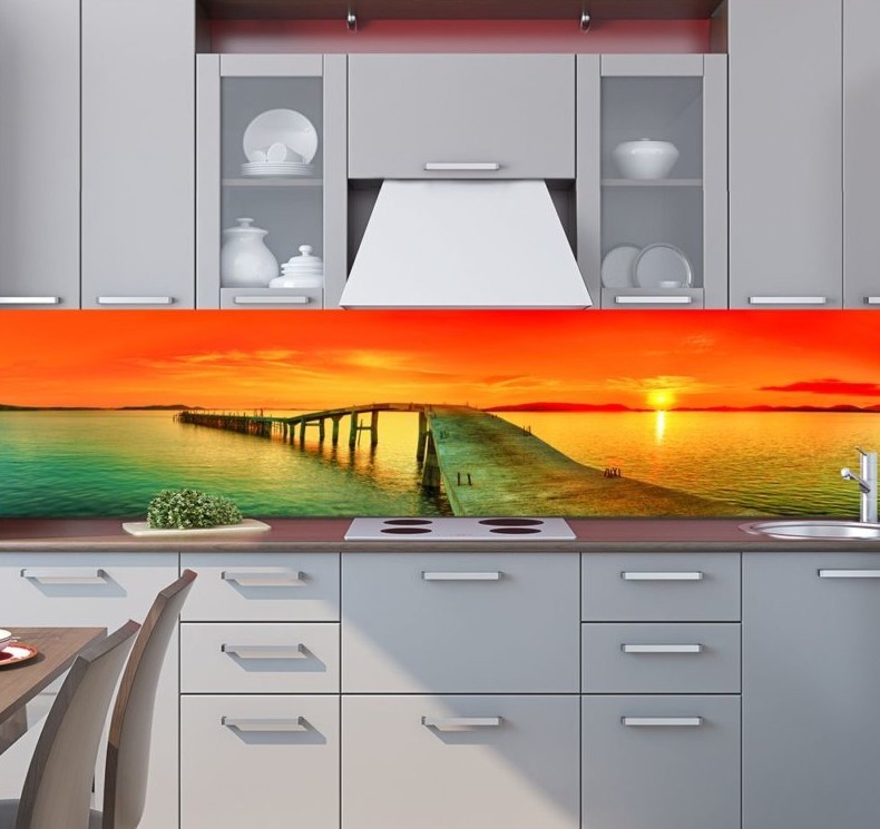 - стекло используется для столешниц в обеденной зоне, а также для защиты стены фартука от брызг. В последнем случае не обязательно использовать керамическую плитку или другие материалы, а можно лишь оклеить стену обоями или окрасить, а для защиты использовать ударопрочное стекло. Особенно популярны стеклянные панели с рисунком. Их легко мыть специальными средствами и они не теряют первоначального вида.